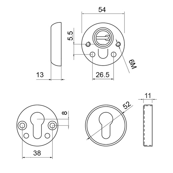 Дана модель DISEC BD54 DIN ROUND встановлюється на вхідні двері разом із замками і серцевинами стандарту EURO DIN. Це захисний протектор з 3-м класом зламостійкості. Виготовлений із гартованої сталі. Монтується накладним методом та може бути втопленим в накладку МДФ спеціальним кільцем (докуповується окремо). Протектор захищає від фізичних та силових методів зламу — свердління, виламування та вибивання.