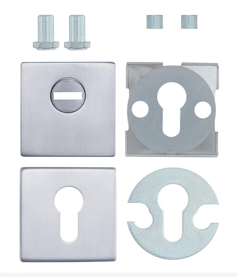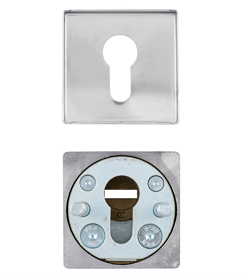 Захисна дверна фурнітура чеського виробника ROSTEX вже давно завоювала прихильність у власників квартир, будинків та комерційних приміщень. Обов'язковим аксесуаром вхідних дверей для захисту Вашої оселі є протектор (або броненакладка). Оскільки їхньою найслабшою точкою є замок з серцевиною, то дуже часто злочинці намагаються потрапити всередину приміщення просто вириваючи їх. Для протидії такому методу взлому і потрібна броненакладка. Дана модель ROSTEX Quadrum R3/H встановлюється на вхідні двері разом із замками і серцевинами стандарту EURO DIN. По дизайну і кольору відповідає аналогічній моделі ручок на розеті. Це захисний протектор з 3-м класом зламостійкості. Виготовлений із нержавіючої сталі, тому може використовуватись у вуличних умовах. Монтується накладним методом. Він простіший за врізний та не потребує висвердлювання отворів для посадки броненакладки. Проте в такому випадку вона не утворює із замком монолітну конструкцію, через що легше дістатись до стяжних гвинтів і зрізати їх. Простір між протектором і серцевиною, хоч і мінімальний, проте залишається. Саме кріплення здійснюється стяжними гвинтами М7. Довжина гвинтів дозволяє ставити броненакладку на дверні полотна товщиною від 38 до 45 мм. Є додаткова можливість подовження до 100 мм. Ці цифри вказані з урахуванням того, що гвинти закручені на всю довжину кріпильного отвору. Таким чином, протектор захищає серцевину від фізичних та силових методів злому — свердління та вибивання. Висота (або товщина) протектора складає 23 мм. Квадратна форма в кольорі матової нержавіючої сталі найкраще буде доповнювати двері світлих відтінків - від тепло-сірих до бежевих.