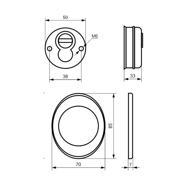 Для монтажу по його діаметру робиться отвір в дверному полотні. Кріпиться довкола серцевини стяжними гвинтами, створюючи монолітну конструкцію з нею. Таким чином, протектор захищає її разом із точкою кріплення в дверях від фізичних та силових методів злому — свердління, виламування та вибивання. Доступу до гвинтів кріплення немає і зірвати саму броненакладку надзвичайно складно. Висота (або товщина) її складає 25/33/42 мм, діаметр - 50 мм. Комплектується декоративною накладкою розміром 85х70 мм для надання дверному полотну більш охайного вигляду. В кольорі “матовий хром” найкраще буде доповнювати двері світлих відтінків - від тепло-сірих до бежевих.