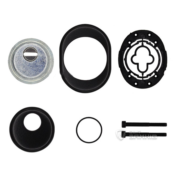 Для монтажу по діаметру протектора робиться отвір в дверному полотні. Кріпиться довкола серцевини стяжними гвинтами, створюючи монолітну конструкцію з нею. Таким чином, протектор захищає її разом із точкою кріплення в дверях від фізичних та силових методів злому — свердління, виламування та вибивання. Доступу до гвинтів кріплення немає і зірвати саму броненакладку надзвичайно складно. Висота (або товщина) її складає 25 мм, діаметр - 50 мм. В чорному кольорі найкраще буде доповнювати двері аналогічних відтінків для того, щоб максимально уникнути контрастів та не привертати зайвої уваги.