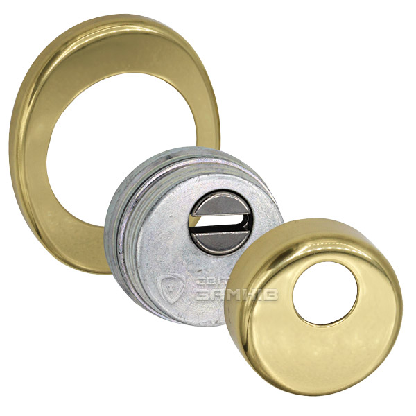 Для монтажу по діаметру протектора робиться отвір в дверному полотні. Кріпиться довкола серцевини стяжними гвинтами, створюючи монолітну конструкцію aз нею. Таким чином, протектор захищає її разом із точкою кріплення в дверях від фізичних та силових методів злому — свердління, виламування та вибивання. Доступу до гвинтів кріплення немає і зірвати саму броненакладку надзвичайно складно. Висота (або товщина) її складає 25/33 мм, діаметр - 50 мм. Комплектується декоративною накладкою розміром 85х70 мм для надання дверному полотну більш охайного вигляду. В кольорі “полірована латунь” найкраще буде доповнювати двері світлих відтінків.