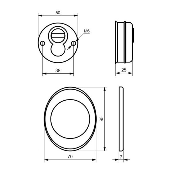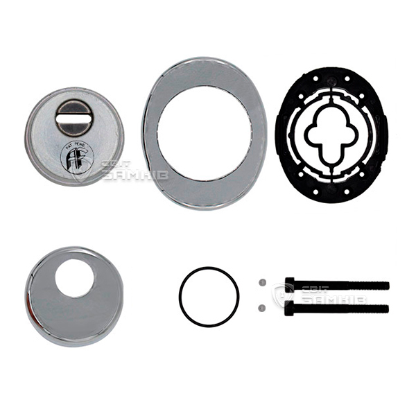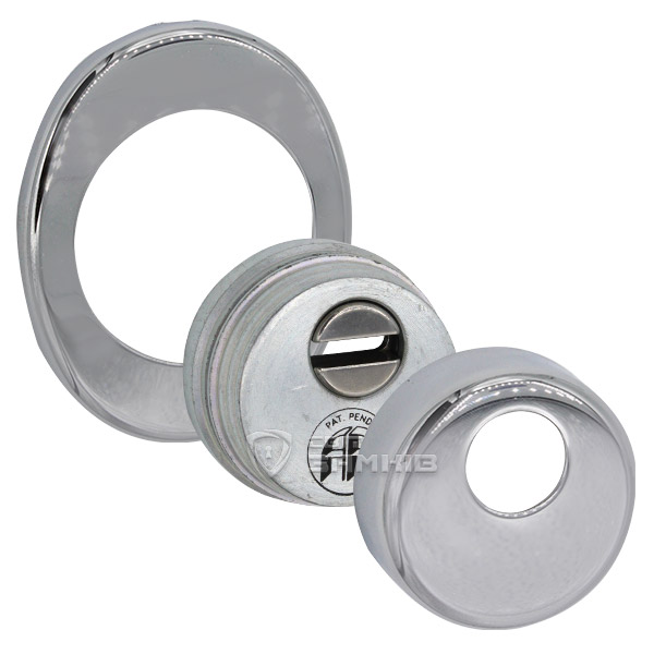 Для монтажу по діаметру протектора робиться отвір в дверному полотні. Кріпиться довкола серцевини стяжними гвинтами, створюючи монолітну конструкцію з нею. Таким чином, протектор захищає її разом із точкою кріплення в дверях від фізичних та силових методів злому — свердління, виламування та вибивання. Доступу до гвинтів кріплення немає і зірвати саму броненакладку надзвичайно складно. Висота (або товщина) її складає 25 мм, діаметр - 50 мм. Комплектується декоративною накладкою розміром 85х70 мм для надання дверному полотну більш охайного вигляду. В кольорі “хром” найкраще буде доповнювати двері світлих відтінків - від тепло-сірих до бежевих.
