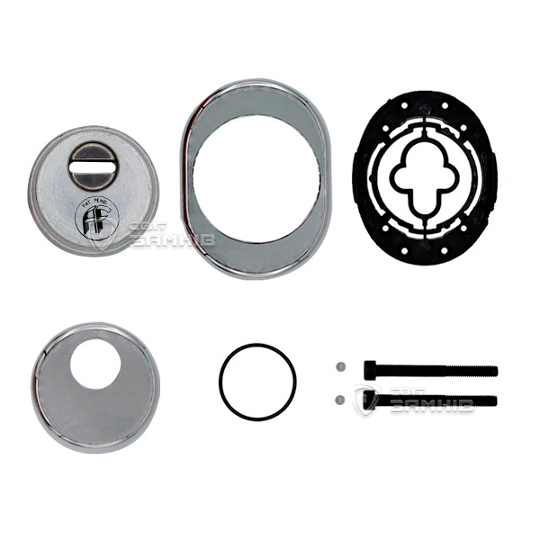 Для монтажу по діаметру протектора робиться отвір в дверному полотні. Кріпиться довкола серцевини стяжними гвинтами, створюючи монолітну конструкцію з нею. Таким чином, протектор захищає її разом із точкою кріплення в дверях від фізичних та силових методів злому — свердління, виламування та вибивання. Доступу до гвинтів кріплення немає і зірвати саму броненакладку надзвичайно складно. Висота (або товщина) її складає 25 мм, діаметр - 50 мм. В кольорі “хром” найкраще буде доповнювати двері світлих відтінків - від тепло-сірих до бежевих.