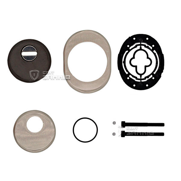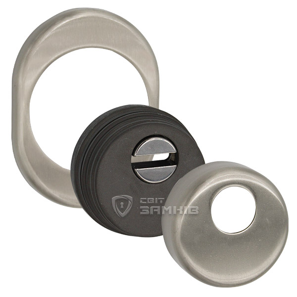 Для монтажу по діаметру протектора робиться отвір в дверному полотні. Кріпиться довкола серцевини стяжними гвинтами, створюючи монолітну конструкцію з нею. Таким чином, протектор захищає її разом із точкою кріплення в дверях від фізичних та силових методів злому — свердління, виламування та вибивання. Доступу до гвинтів кріплення немає і зірвати саму броненакладку надзвичайно складно. Висота (або товщина) її складає 25 мм, діаметр - 50 мм. В кольорі “нікель сатин” найкраще буде доповнювати двері світлих відтінків - від тепло-сірих до бежевих.