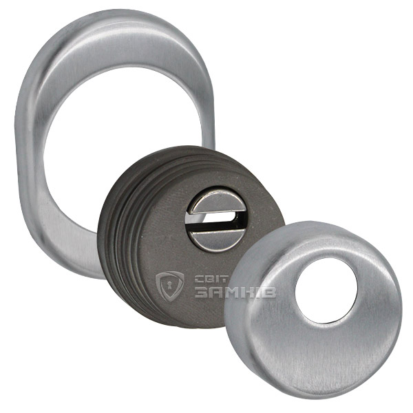 Для монтажу по діаметру протектора робиться отвір в дверному полотні. Кріпиться довкола серцевини стяжними гвинтами, створюючи монолітну конструкцію з нею. Таким чином, протектор захищає її разом із точкою кріплення в дверях від фізичних та силових методів злому — свердління, виламування та вибивання. Доступу до гвинтів кріплення немає і зірвати саму броненакладку надзвичайно складно. Висота (або товщина) її складає 25/33 мм, діаметр - 50 мм. В кольорі “матовий хром” найкраще буде доповнювати двері світлих відтінків - від тепло-сірих до бежевих.
