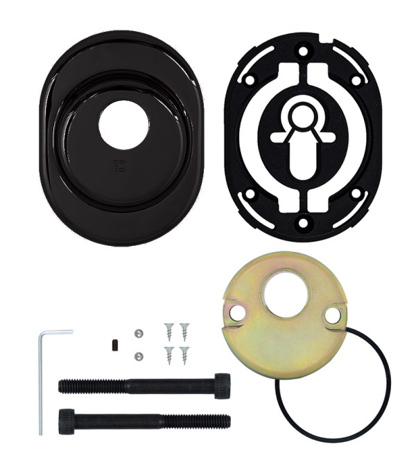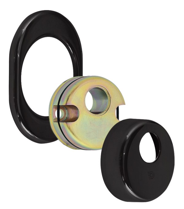 Монтується врізним методом: по його діаметру робиться отвір в дверному полотні. Кріпиться наскрізно довкола серцевини стяжними гвинтами М6 з технологією Flex. Її суть заключається в дрібнішій різьбі та спеціальній насічці. Завдяки цьому та спеціальному виду твердої сталі гвинти витримують навантаження в 5 раз більше, ніж звичайні. Так вони створюють монолітну конструкцію із серцевиною. Висота (або товщина) протектора складає 21 мм, діаметр - 50 мм. Протектор для зовнішньої сторони дверей обирається окремо. В чорному кольорі найкраще буде доповнювати двері аналогічних відтінків для того, щоб максимально уникнути контрастів та не привертати зайвої уваги.