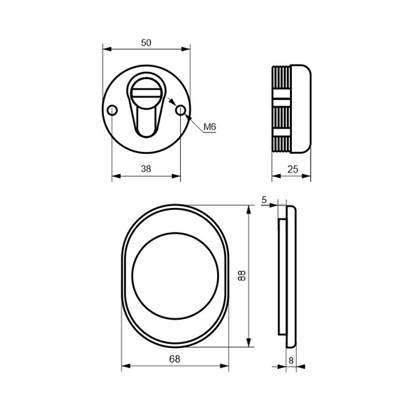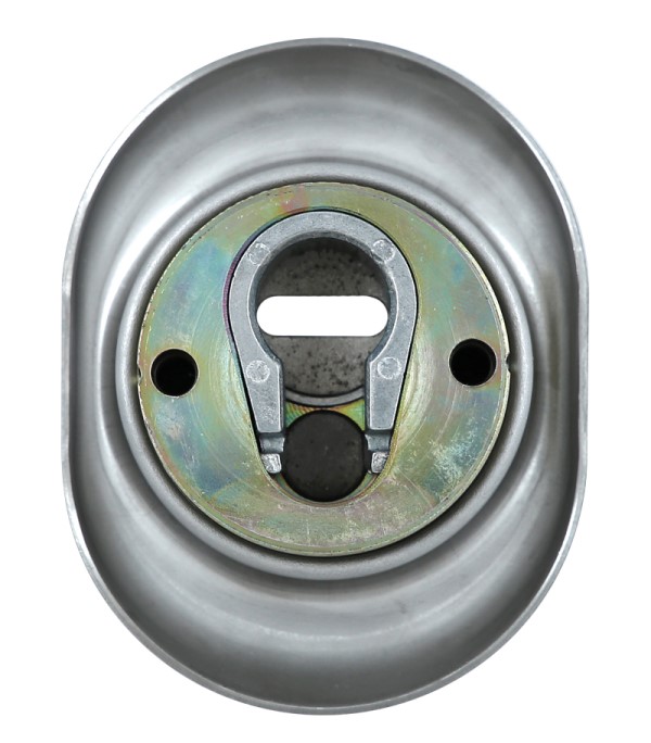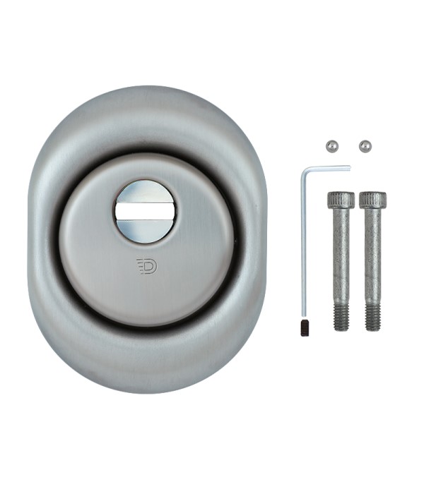 Монтується врізним методом: по його діаметру робиться отвір в дверному полотні. Кріпиться наскрізно довкола серцевини стяжними гвинтами М6 з технологією Flex. Її суть заключається в дрібнішій різьбі та спеціальній насічці. Завдяки цьому та спеціальному виду твердої сталі гвинти витримують навантаження в 5 раз більше, ніж звичайні. Так вони створюють монолітну конструкцію із серцевиною. Таким чином, протектор захищає її разом із точкою кріплення в дверях від фізичних та силових методів злому — свердління, виламування та вибивання. Доступу до гвинтів кріплення немає і зірвати саму броненакладку надзвичайно складно. Також вкручується в посилену зовнішню “юбку”. Висота (або товщина) протектора складає 25 мм, діаметр - 50 мм. Виготовлений із латуні. Монтується на двері за допомогою пластика та саморізів. В кольорі матової нержавіючої сталі найкраще буде доповнювати двері світлих відтінків - від тепло-сірих до бежевих.