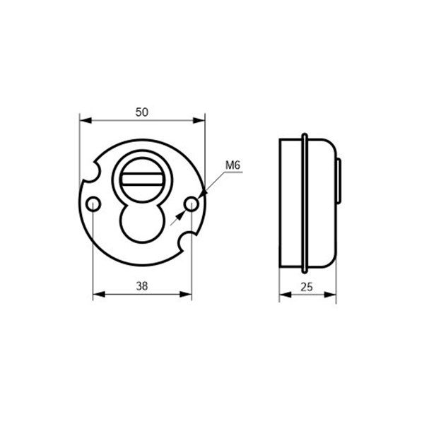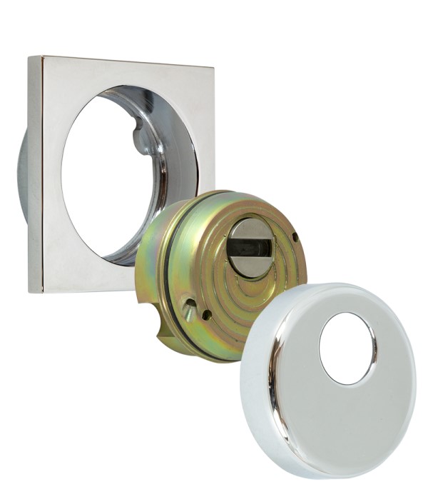 Монтується врізним методом: по його діаметру робиться отвір в дверному полотні. Кріпиться наскрізно довкола серцевини стяжними гвинтами М6 з технологією Flex. Її суть заключається в дрібнішій різьбі та спеціальній насічці. Завдяки цьому та спеціальному виду твердої сталі гвинти витримують навантаження в 5 раз більше, ніж звичайні. Так вони створюють монолітну конструкцію із серцевиною. Таким чином, протектор захищає її разом із точкою кріплення в дверях від фізичних та силових методів злому — свердління, виламування та вибивання. Доступу до гвинтів кріплення немає і зірвати саму броненакладку надзвичайно складно. Також вкручується в посилену зовнішню “юбку”. Висота (або товщина) протектора складає 25 мм, діаметр - 50 мм, зовнішня декоративна накладка - 65х65 мм. Монтується на двері за допомогою захисної шайби та гвинтів М6х40мм або саморізами. В кольорі “хром полірований” найкраще буде доповнювати двері світлих відтінків - від тепло-сірих до бежевих.