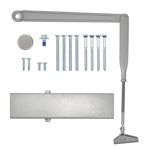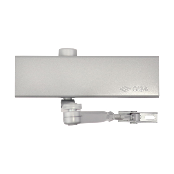 CISA C1610.03 – це надійний дотягувач із серії Professional Plus2, що призначений для накладного монтажу на внутрішніх і зовнішніх дверях. Він підходить для дверних полотен із максимальною вагою до 80 кг і шириною до 1100 мм. На передній частині корпусу розташовані регулювальні гвинти, які дозволяють налаштувати основну швидкість зачинення (в межах 180°-15°), швидкість захлопування (15°-0°) та функцію гальма відчинення (180°-50°). Ця функція, також відома як "вітрове гальмо," забезпечує додатковий захист дверного полотна, запобігаючи його удару об стіну чи пошкодженню механізму тяги.
