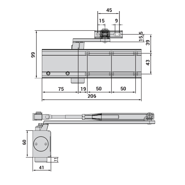 - Регулювання основної швидкості, швидкості захлопування та гальма відчинення гвинтами на корпусі.