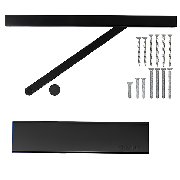 Сила закривання регулюється в межах EN 1-4 за допомогою гвинта, розташованого збоку корпусу. Комплектація включає ковзну тягу, яка дозволяє зафіксувати двері у відкритому положенні. Це зручне рішення, яке забезпечує можливість залишати двері відчиненими, наприклад, для провітрювання приміщення або створення комфортних умов під час використання у комерційних об'єктах.