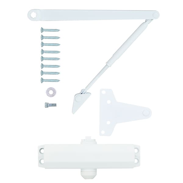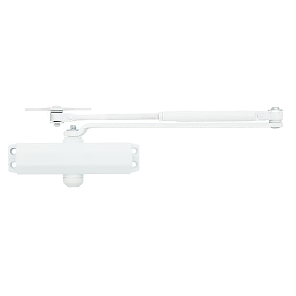 Продукція японського виробника RYOBI по праву визнана в усьому світі завдяки своїй відмінній якості. Дана модель RYOBI 8803 UNIV встановлюється накладним монтажем на легкі дверні полотна масою до 65 кг та шириною до 965 мм. Є можливість встановлення за допомогою кронштейна паралельного положення тяги відносно дверей задля збереження дизайну приміщення чи використання дотягувача в умовах обмеженого простору. Тоді максимальна вага і ширина полотна повинні бути меншими. Гідравлічний привід забезпечує чітку роботу дотягувача з кутом відкривання до 180°. Безпосередньо на корпусі є можливість регулювати основну швидкість в межах 180°-10° та швидкість захлопування - 10°-0°. Завдяки цьому можна досягнути індивідуального налаштування зачинення дверей так як Вам потрібно. Особливістю дотягувачів RYOBI є спеціальне термоконстантне масло. Воно забезпечує стабільну роботу навіть при великому перепаді температур. Взагалі робоча температура варіюється в діапазоні від -20 до +45°С. RYOBI 8803 UNIV може бути встановлений на ліво і правосторонні двері з можливістю відкривання як всередину так і назовні. В даній комплектації присутня стандартна тяга без фіксації дверного полотна у відкритому положенні. Проте даний дотягувач сертифікований для використання з протипожежними дверима. В білому кольорі найкраще буде доповнювати двері подібних світлих відтінків для того, щоб максимально уникнути контрастів та не привертати зайвої уваги.