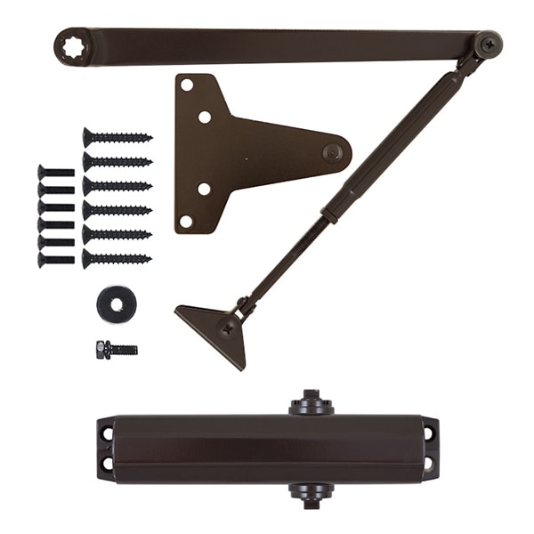 Продукція японського виробника RYOBI по праву визнана в усьому світі завдяки своїй відмінній якості. Дана модель RYOBI D-1504 UNIV встановлюється накладним монтажем на дверні полотна масою до 80 кг та шириною до 1100 мм. Є можливість встановлення за допомогою кронштейна паралельного положення тяги відносно дверей задля збереження дизайну приміщення чи використання дотягувача в умовах обмеженого простору. Тоді максимальна вага і ширина полотна повинні бути меншими. Гідравлічний привід забезпечує чітку роботу дотягувача з кутом відкривання до 180°. Безпосередньо на корпусі є можливість регулювати основну швидкість в межах 180°-10° та швидкість захлопування - 10°-0°. Завдяки цьому можна досягнути індивідуального налаштування зачинення дверей так як Вам потрібно. Особливістю дотягувачів RYOBI є спеціальне термоконстантне масло. Воно забезпечує стабільну роботу навіть при великому перепаді температур. Взагалі робоча температура варіюється в діапазоні від -20 до +45°С. RYOBI D-1504 UNIV може бути встановлений на ліво і правосторонні двері з можливістю відкривання як всередину так і назовні. В даній комплектації присутня стандартна тяга без фіксації дверного полотна у відкритому положенні. Проте даний дотягувач сертифікований для використання з протипожежними дверима. В коричневому кольорі найкраще буде доповнювати двері подібних темних відтінків для того, щоб максимально уникнути контрастів та не привертати зайвої уваги.