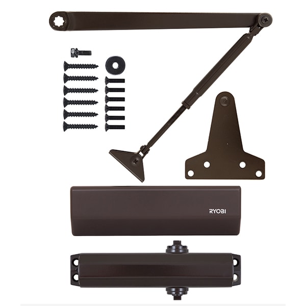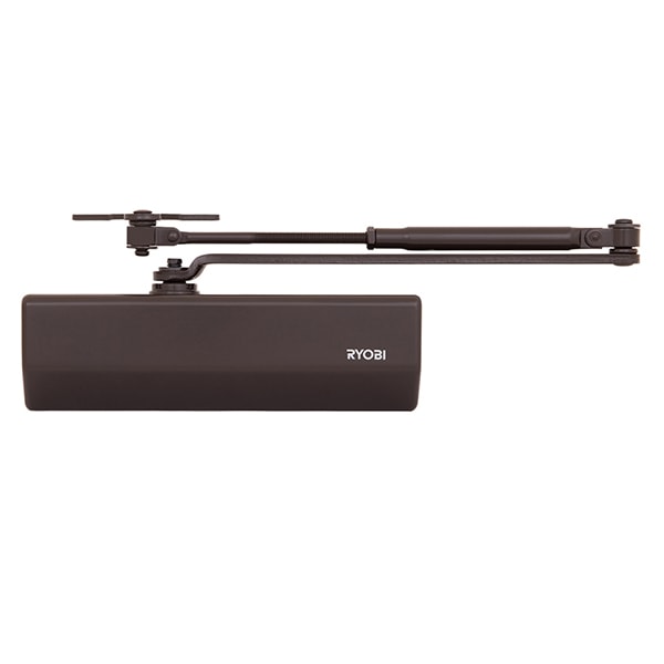 Продукція японського виробника RYOBI по праву визнана в усьому світі завдяки своїй відмінній якості. Дана модель RYOBI D-1554 UNIV встановлюється накладним монтажем на легкі дверні полотна масою до 80 кг та шириною до 1200 мм. Є можливість встановлення за допомогою кронштейна паралельного положення тяги відносно дверей задля збереження дизайну приміщення чи використання дотягувача в умовах обмеженого простору. Тоді максимальна вага і ширина полотна повинні бути меншими. Гідравлічний привід забезпечує чітку роботу дотягувача з кутом відкривання до 180°. Безпосередньо на корпусі є можливість регулювати основну швидкість в межах 180°-10°, та швидкість захлопування - 10°-0°. Завдяки цьому можна досягнути індивідуального налаштування зачинення дверей так як Вам потрібно. Особливістю дотягувачів RYOBI є спеціальне термоконстантне масло. Воно забезпечує стабільну роботу навіть при великому перепаді температур. Взагалі робоча температура варіюється в діапазоні від -20 до +45°С. RYOBI D-1554 UNIV може бути встановлений на ліво і правосторонні двері з можливістю відкривання як всередину так і назовні. В даній комплектації присутня стандартна тяга без фіксації дверного полотна у відкритому положенні. Проте даний дотягувач сертифікований для використання з протипожежними дверима. В коричневому кольорі найкраще буде доповнювати двері подібних темних відтінків для того, щоб максимально уникнути контрастів та не привертати зайвої уваги.