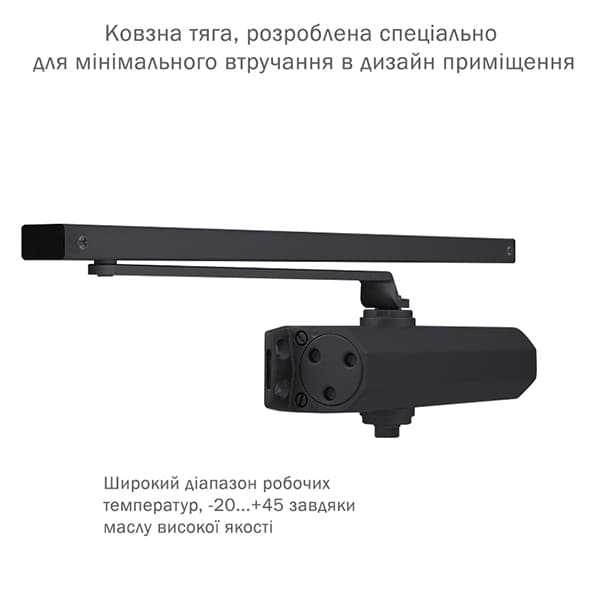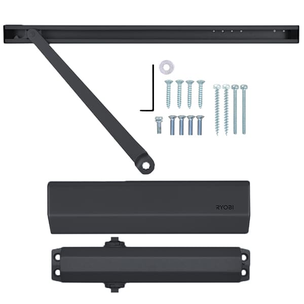 Продукція японського виробника RYOBI по праву визнана в усьому світі завдяки своїй відмінній якості. Дана модель RYOBI D-2050T BC SLD встановлюється накладним монтажем на дверні полотна масою до 60 кг та шириною до 950 мм. Гідравлічний привід забезпечує чітку роботу дотягувача з кутом відкривання до 120°. Безпосередньо на корпусі є можливість регулювати основну швидкість в межах 120°-10°, швидкість захлопування - 10°-0° та гальмо відчинення - 75°-120°. Дана функція захищає дверне полотно від удару об стіну та виривання тяги дотягувача. Завдяки цьому можна досягнути індивідуального налаштування зачинення дверей так як Вам потрібно. Особливістю дотягувачів RYOBI є спеціальне термоконстантне масло. Воно забезпечує стабільну роботу навіть при великому перепаді температур. Взагалі робоча температура варіюється в діапазоні від -20 до +45°С. RYOBI D-2050T BC SLD може бути встановлений на ліво і правосторонні двері з можливістю відкривання як всередину так і назовні. В даній комплектації присутня ковзна тяга без фіксації дверного полотна у відкритому положенні. Проте даний дотягувач сертифікований для використання з протипожежними дверима. В кольорі “сірий антрацит” найкраще буде доповнювати двері подібних світлих відтінків для того, щоб максимально уникнути контрастів та не привертати зайвої уваги.