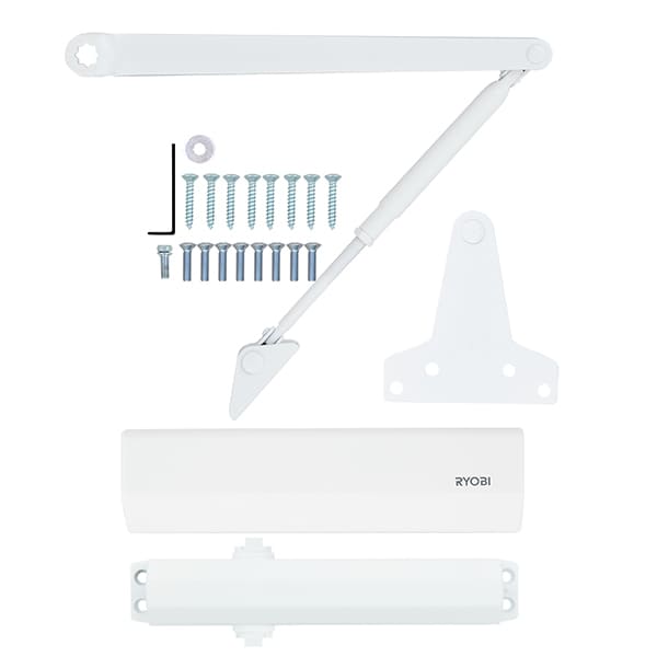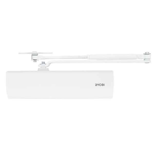 Продукція японського виробника RYOBI по праву визнана в усьому світі завдяки своїй відмінній якості. Дана модель RYOBI D-2055V BC UNIV встановлюється накладним монтажем на дверні полотна масою до 100 кг та шириною до 1250 мм. Є можливість встановлення за допомогою кронштейна паралельного положення тяги відносно дверей задля збереження дизайну приміщення чи використання дотягувача в умовах обмеженого простору. Тоді максимальна вага і ширина полотна повинні бути меншими. Гідравлічний привід забезпечує чітку роботу дотягувача з кутом відкривання до 180°. Безпосередньо на корпусі є можливість регулювати основну швидкість в межах 180°-10°, швидкість захлопування - 10°-0° та гальмо відчинення - 75°-180°. Дана функція захищає дверне полотно від удару об стіну та виривання тяги дотягувача. Завдяки цьому можна досягнути індивідуального налаштування зачинення дверей так як Вам потрібно. Особливістю дотягувачів RYOBI є спеціальне термоконстантне масло. Воно забезпечує стабільну роботу навіть при великому перепаді температур. Взагалі робоча температура варіюється в діапазоні від -20 до +45°С. RYOBI D-2055V BC UNIV може бути встановлений на ліво і правосторонні двері з можливістю відкривання як всередину так і назовні. В даній комплектації присутня стандартна тяга без фіксації дверного полотна у відкритому положенні. Проте даний дотягувач сертифікований для використання з протипожежними дверима. В білому кольорі найкраще буде доповнювати двері подібних світлих відтінків для того, щоб максимально уникнути контрастів та не привертати зайвої уваги.