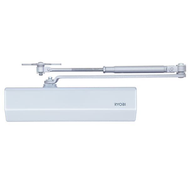 Продукція японського виробника RYOBI по праву визнана в усьому світі завдяки своїй відмінній якості. Дана модель RYOBI D-2055V BC UNIV встановлюється накладним монтажем на дверні полотна масою до 100 кг та шириною до 1250 мм. Є можливість встановлення за допомогою кронштейна паралельного положення тяги відносно дверей задля збереження дизайну приміщення чи використання дотягувача в умовах обмеженого простору. Тоді максимальна вага і ширина полотна повинні бути меншими. Гідравлічний привід забезпечує чітку роботу дотягувача з кутом відкривання до 180°. Безпосередньо на корпусі є можливість регулювати основну швидкість в межах 180°-10°, швидкість захлопування - 10°-0° та гальмо відчинення - 75°-180°. Дана функція захищає дверне полотно від удару об стіну та виривання тяги дотягувача. Завдяки цьому можна досягнути індивідуального налаштування зачинення дверей так як Вам потрібно. Особливістю дотягувачів RYOBI є спеціальне термоконстантне масло. Воно забезпечує стабільну роботу навіть при великому перепаді температур. Взагалі робоча температура варіюється в діапазоні від -20 до +45°С. RYOBI D-2055V BC UNIV може бути встановлений на ліво і правосторонні двері з можливістю відкривання як всередину так і назовні. В даній комплектації присутня стандартна тяга без фіксації дверного полотна у відкритому положенні. Проте даний дотягувач сертифікований для використання з протипожежними дверима. В сірому кольорі найкраще буде доповнювати двері подібних відтінків для того, щоб максимально уникнути контрастів та не привертати зайвої уваги.