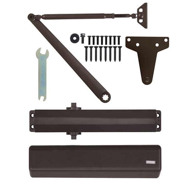 Продукція японського виробника RYOBI по праву визнана в усьому світі завдяки своїй відмінній якості. Дана модель RYOBI D-3550 BC/DA UNIV встановлюється накладним монтажем на дверні полотна масою до 100 кг та шириною до 1250 мм. Є можливість встановлення за допомогою кронштейна паралельного положення тяги відносно дверей задля збереження дизайну приміщення чи використання дотягувача в умовах обмеженого простору. Тоді максимальна вага і ширина полотна повинні бути меншими. Гідравлічний привід забезпечує чітку роботу дотягувача з кутом відкривання до 180°. Безпосередньо на корпусі є можливість регулювати основну швидкість в межах 180°-10°, швидкість захлопування - 10°-0° та гальмо відчинення - 75°-180°. Дана функція захищає дверне полотно від удару об стіну та виривання тяги дотягувача. Також фішкою цієї моделі є функція уповільнення зачинення. Це зручно, коли проходять багато людей чи потрібно занести вантаж. Загалом завдяки таким можливостям регулювання можна добитись максимально індивідуального налаштування зачинення дверей. Особливістю дотягувачів RYOBI є спеціальне термоконстантне масло. Воно забезпечує стабільну роботу навіть при великому перепаді температур. Взагалі робоча температура варіюється в діапазоні від -20 до +45°С. RYOBI D-3550 BC/DA UNIV може бути встановлений на ліво і правосторонні двері з можливістю відкривання як всередину так і назовні. В даній комплектації присутня стандартна тяга без фіксації дверного полотна у відкритому положенні. Проте даний дотягувач сертифікований для використання з протипожежними дверима. В коричневому кольорі найкраще буде доповнювати двері подібних темних відтінків для того, щоб максимально уникнути контрастів та не привертати зайвої уваги.