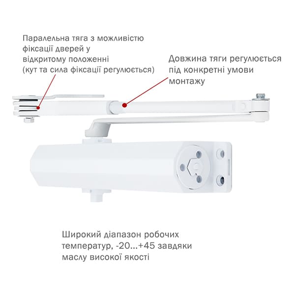 Також слід розуміти які додаткові функції Вам потрібні. Окрім стандартного дотягування дверного полотна, більш дорожчі моделі мають функцію фіксації у відкритому положенні. Це створює додаткову зручність, адже можна зафіксувати двері у відчиненому стані. Можливі нюанси і стосовно місця встановлення. До прикладу, якщо заважає стіна, то потрібно ставити монтажну пластину або дотягувач із ковзною тягою, він виглядає набагато естетичніше, але ставлять його переважно на легкі двері.