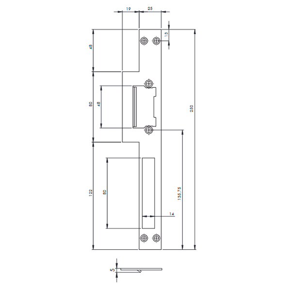 DORCAS H2 LAP – це зворотня планка, яка призначена для встановлення електромеханічних защіпок у рами дерев’яних ПРАВОСТОРОННІХ дверей з прямокутним торцем (без притвору). Сумісна з електромеханічними защіпками DORCAS серії та 99. Містить отвір для основного ригеля замка та язичка.