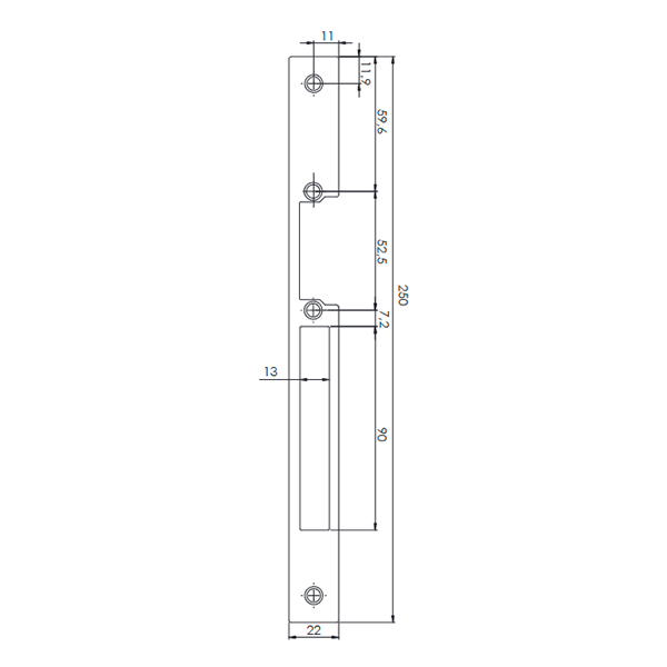 DORCAS L22 HZ – це зворотня планка, яка призначена для встановлення електромеханічних защіпок у рами прямих дерев’яних та металевих дверей з притвором. Сумісна з електромеханічними защіпками DORCAS серій 50 та 99. Містить отвір для основного ригеля замка та язичка.