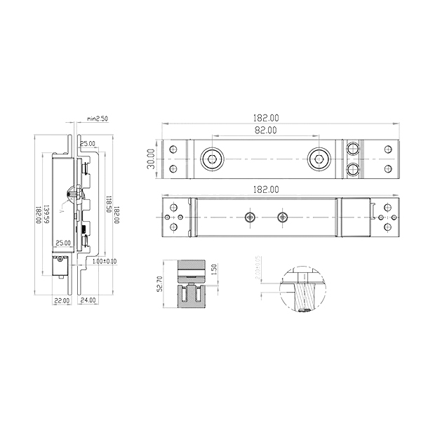 • Розміри – замок з кріпильною планкою: 182x30x25 мм, зворотня планка: 182x30x23,6 мм.