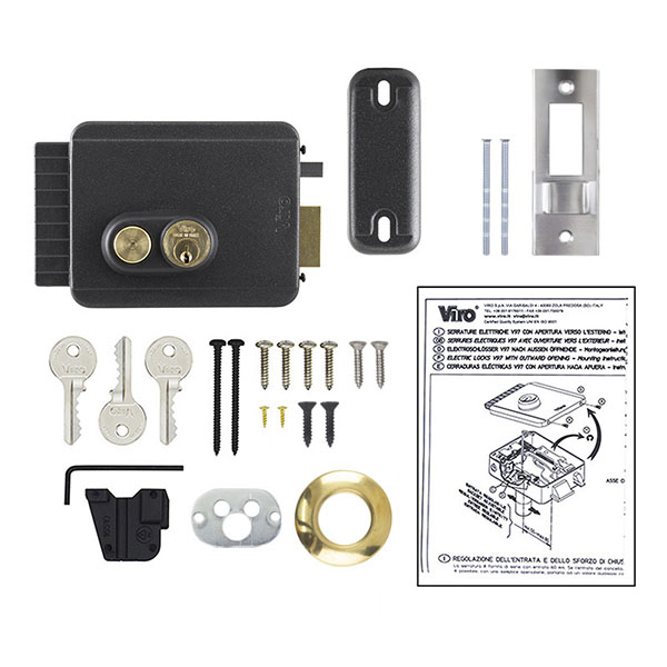 Замок VIRO V97 8973.0712.1 працює в нормально замкненому стані. Це означає, що розблокування закритого замка відбувається при короткочасній подачі живлення 12V AC. Поворотом ключа з внутрішньої сторони можна обмежити дію функції “Денний режим”, при якому замок постійно може перебувати в відімкненому стані. Замок містить 2 ригеля: основний косий, який  автоматично блокується при замиканні замка, та додатковий – механічний виштовхувач основного ригеля. Він відділений від основного ригеля та призначений для гарантії спрацювання замикання замка у випадку можливого вертикального зсуву корпусу замка по відношенню до запірної планки з похибкою +/- 6мм.