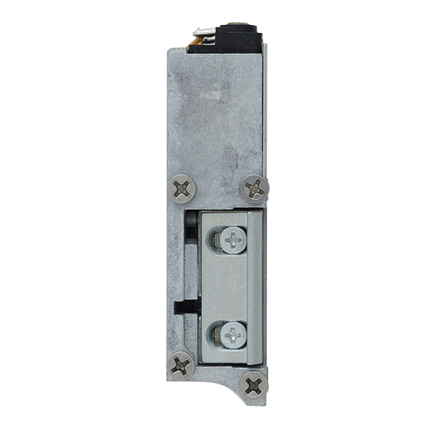 Електрозащіпка працює в нормально замкненому стані. Це означає, що вона замкнена без живлення, а відмикання відбувається поданням напруги. Напруга складає 6-12В постійного струму. Має язичок спеціальної радіальної форми, яка при відкриванні зміщується в глибину защіпки. За рахунок цього виріз в рамі під нього потрібен буде мінімальний. Язичок регулюється відносно корпусу з діапазоном 5 мм. Зворотня планка докуповується окремо в залежності від Ваших потреб.