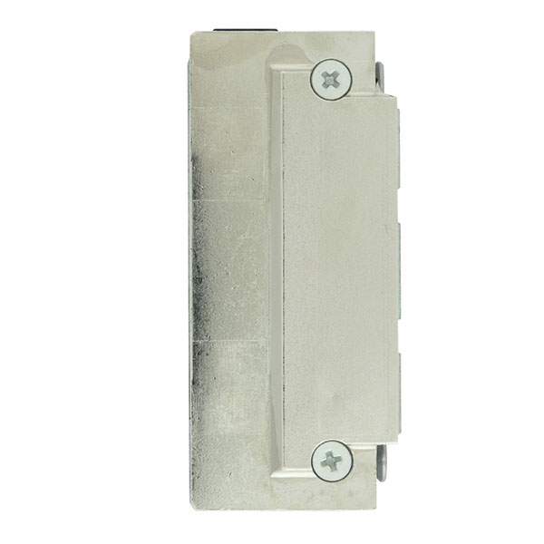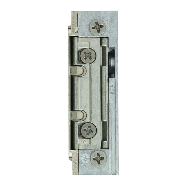 Електрозащіпка працює в нормально відімкненому стані. Це означає, що вона замкнена при подачі живлення, а відмикання відбувається зняттям напруги. Стане особливо актуальним для випадків, коли існує необхідність забезпечити гарантоване розблокування відчинених дверей при зникненні напруги живлення. Наприклад, для безперешкодної швидкої евакуації людей без використання ключів. Напруга складає 12В постійного струму. Має язичок спеціальної радіальної форми, яка при відкриванні зміщується в глибину защіпки. За рахунок цього виріз в рамі під нього потрібен буде мінімальний. Язичок регулюється відносно корпусу з діапазоном 3 мм.