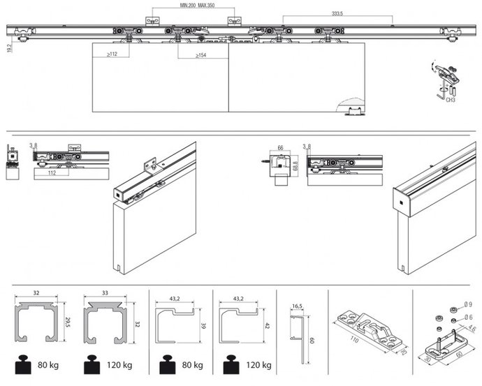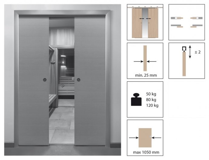 Наша рекомендація: Підбирайте систему з запасом по вазі навантаження. Напкриклад, якщо у Вас двері виготовлені з масиву дуба, приблизна вага 80 кг. Рекомендуємо вибрати систему розраховану на 100-120 кг. Такий запас буде гарантією довгої роботи!