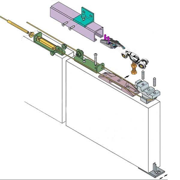1в.jpg Матеріал дверейдерев’яні чи скляні. В конкретній моделі розсувної системи спосіб кріплення роликів до полотна відрізняється. Для дерев’яних дверей – ролики прикручуються до полотна шурупами. Скляні двері затискаються між кріпленням, ніби в «лещатах». Є спеціальні проставки, щоб не пошкодити скло.