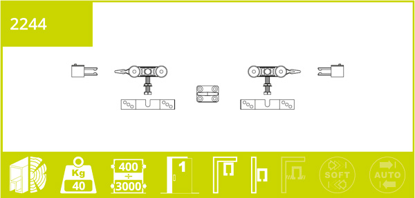 Італійський виробник розсувних систем Villes2000 створює свою продукцію, тісно співпрацюючи з найбільш відомими дизайнерами. Разом із суворим контролем якості це дає споживачам відмінний у всіх сенсах асортимент, який здатний задовольнити будь-які потреби. Дана модель VILLES 2244 підходить для одного дверного полотна із дерева або профілю шириною від 400 мм, товщиною від 16 до 40 мм та вагою до 40 кг. Відкривання відбувається паралельно стіні. Ролики із ковзаючим підшипником забезпечують тихий та легкий хід. Це дає можливість встановити розсувні двері в приміщеннях, де зайвий шум небажаний, наприклад в спальні. VILLES 2244 буде вдалим рішенням там, де потрібно максимально ергономічно розпорядитися житловим простором чи раціонально виконати зонування. Вона максимально органічно впишеться в будь-який стиль приміщення - будь то класика чи сучасний хай-тек. Монтується дана модель як до стелі, так і до стіни (кріплення для цього в комплект не входять).