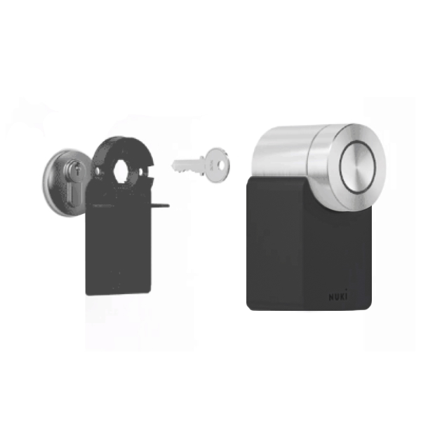 Ключ-ключ: обов’язкова вимога до серцевини – вона повинна працювати у режимі “антипаніка” (керування доступне ззовні, навіть якщо ключ вставлений всередині). В циліндр вставляється активний ключ, на який монтується спеціальний кронштейн. Після цього встановлюється замок NUKI Smart Lock 3.0 Pro.