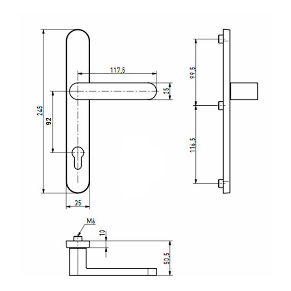 Ручка на планці польського виробника MEDOS є результатом постійного пошуку інноваційних рішень та впровадження сучасних технологій на виробництві. Дана модель MEDOS Brussels із серії FrontLine встановлюється переважно на металопластикові або алюмінієві двері із замком під серцевину. Ручка виконана по спеціальній технології із екструдованого алюмінію. Це забезпечує їй не тільки привабливий зовнішній вигляд, але і високі експлуатаційні властивості - стійкість до подряпин, стирання, вологи і вигорання. В даній комплектації присутні одна нажимна ручка, що монтується зсередини та одна накладка під циліндр, яка може бути в парі з офісною ручкою (до комплекту не входить). Завдяки підпружиненому механізму натискається без особливих зусиль. Основним технічним параметром, за яким її підбирають до замка, є міжосьова відстань. В цій моделі вона становить 92 мм. Анодоване шліфоване покриття забезпечить довготривале використання ручки в первозданному вигляді. Стриманий вигляд в кольорі нержавіючої сталі ідеально підійде для встановлення на двері в сучасних приміщеннях в high-tech стилі. Планка кріпиться до дверного полотна на 3 гвинта. Задля довготривалої експлуатації важливо, щоб це виконувалось правильно та професійно.