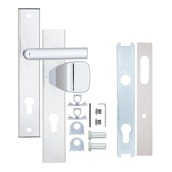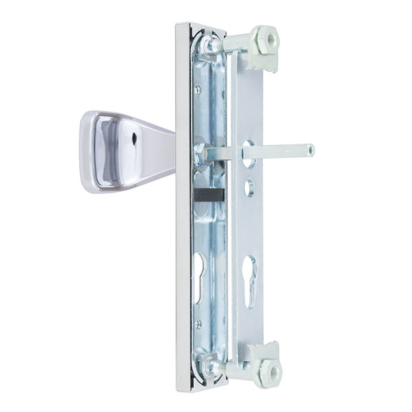 Захисні ручки на планці чеського виробництва ROSTEX. Це дверна фурнітура високої якості розроблена для приміщень з великим трафіком людей. Ручки та планки виготовляються із нержавіючої сталі, а декоративна плата, яка накладається на планку, виготовляється із цинкового сплаву. Монтується ця модель на два стяжні гвинти М8, завдяки чому ручки міцно закріплюються на планці і мають захист від вандального зламу. Все це робить дану фурнітуру стійкою до виламування та інших силових методів. Ще однією особливістю є різний тип ручок. З одного боку це звичайна нажимна ручка, а з іншого фіксована. Такі ручки забезпечать швидке та зручне користування проміжною кімнатою в офісі тощо. Сучасний мінімалістичний дизайн гармонійно доповнить дверне полотно з прямими лініями або скляними вставками. Яскравий колір – хром полірований – чудово підійде для офісного приміщення або квартири в світлих відтінках, а темному дверному полотну додасть трішки контрасту. Покриття методом гальваніки гарантує надійний захист кольорового відтінку від стирання до 120 місяців. При виборі зверніть увагу, що такі ручки підходять лише для механізму замка з міжосьовою відстанню 85 мм. За необхідності монтажу фурнітури на товстіші двері рекомендуємо придбати відповідний подовжуючий набір.