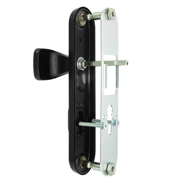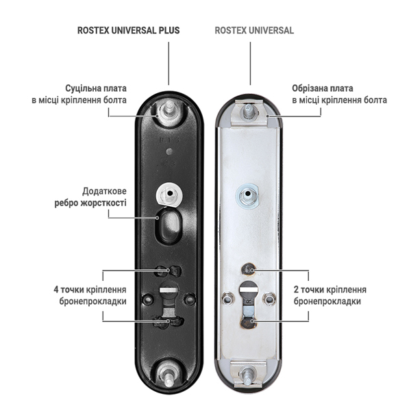 Universal Plus – це зламостійкі ручки на планці з протектором чеського виробництва ROSTEX. Вони чудово підходять для вхідних металевих та деревяних дверей товщиною 38-55мм. Є можливість подовження до 100 мм, але комплект докуповується окремо. Даний тип ручок використовується переважно в офісних приміщеннях, школах, спортивних комплексах та впринципі всюди де потрібен певний рівень захисту приміщення.