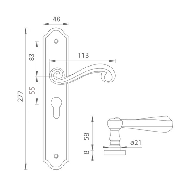 Елегантні ручки на планці португальського виробництва TUPAI. Представляються собою поєднання якості та вишуканого дизайну. Дана серія ручок цільнолита із цинкового сплаву. Завдяки цьому вони достатньо міцні та стійкі до навантажень. Планка також виготовлена із цинкового сплаву, має великі розміри і добре впишеться на масивне дверне полотно. Гальванічне покриття гарантує збереження зовнішнього вигляду ручок до 60 місяців. Вишуканий колір – античне срібло – добре підійде для інтер’єру з темними холодними відтінками і доповнить дверне полотно в класичному стилі. Вдалий вибір ручки на планці залежить від міжосьової відстані, вона буває різною і зумовлена механізмом замка. Ця модель підходить лише для механізмів замка з міжосьовою відстанню 55 мм. Процес кріплення планки до дверного полотна здійснюється за рахунок шурупів або стяжних гвинтів. Вишуканий класичний дизайн чудово довершить інтер’єр з елементами класики та гармонійно підкреслить дверне полотно.