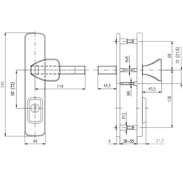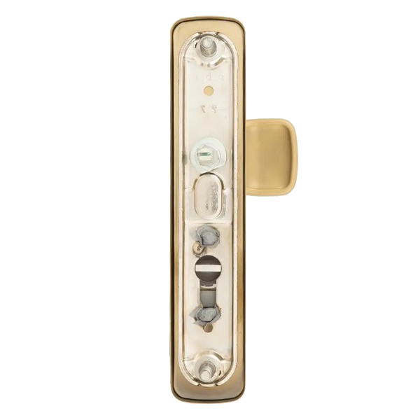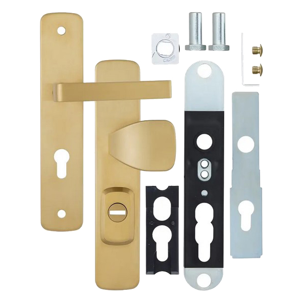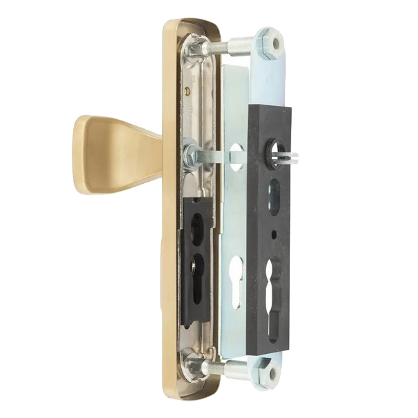 Зламостійкі ручки на планці з протектором чеського виробництва ROSTEX. Якщо у Вас виникає потреба надійно захистити замок та серцевину, то ця модель зможе повністю задовільнити її. Ручки виготовляються із міцної нержавіючої сталі, планки в свою чергу виготовляються із цинкового сплаву. Ззовні планки не видно отворів для кріплення, вони знаходяться в середині і фіксуються за допомогою двох масивних гвинтів М8. Серцевина захищена протектором із гартованої сталі і шайбою з отвором під ключ з нержавіючої сталі. Завдяки цьому ця модель має високий рівень захисту від висвердлювання, виламування та інших силових методів зламу. Кольоровий відтінок захищений спеціальним методом гальваніки, що гарантує його стійкість до стирання протягом 120 місяців. Вдале поєднання кольорів – нержавіюча сталь матова титан PVD – чудово довершить світле приміщення з елементами золота. В цієї моделі тип ручок різний, з одного боку це звичайна нажимна, а з іншого фіксована. Зазвичай такі ручки використовують в приміщеннях з великим трафіком людей. Під час вибору зверніть увагу на міжосьову відстань ручок та Вашого механізму замка. Дані ручки підходять тільки для механізмів замка з міжосьової відстанню 85 мм. За необхідності монтажу фурнітури на товстіші двері рекомендуємо придбати відповідний подовжуючий набір.