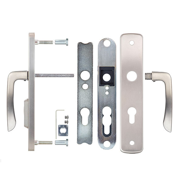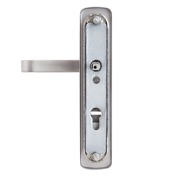 Зламостійкі ручки на планці з протектором чеського виробництва ROSTEX. Якщо у Вас виникає потреба надійно захистити замок та серцевину, то ця модель зможе повністю задовільнити її. Ручки виготовляються із міцної нержавіючої сталі, планки в свою чергу виготовляються із цинкового сплаву. Ззовні планки не видно отворів для кріплення, вони знаходяться в середині і фіксуються за допомогою двох масивних гвинтів М8. Серцевина захищена протектором із гартованої сталі і шайбою з отвором під ключ з нержавіючої сталі. Завдяки цьому ця модель має високий рівень захисту від висвердлювання, виламування та інших силових методів зламу. Кольоровий відтінок захищений спеціальним методом гальваніки, що гарантує його стійкість до стирання протягом 120 місяців. Колір нержавіюча сталь матова – чудово доповнить приміщення в холодних світлих тонах, а інтер’єру в темних відтінках додасть трохи контрасту. Ця модель оснащена зручною нажимною частиною з металевим пружиним механізмом, завдяки чому ручки не будуть провисати та розхитуватись. Під час вибору зверніть увагу на міжосьову відстань ручок та Вашого механізму замка. Дані ручки підходять тільки для механізмів замка з міжосьової відстанню 85 мм. За необхідності монтажу фурнітури на товстіші двері рекомендуємо придбати відповідний подовжуючий набір.