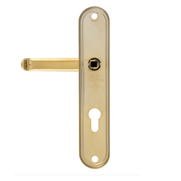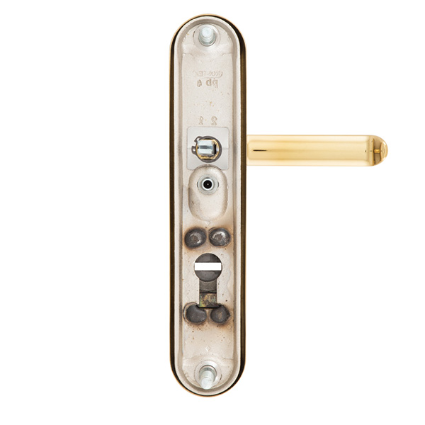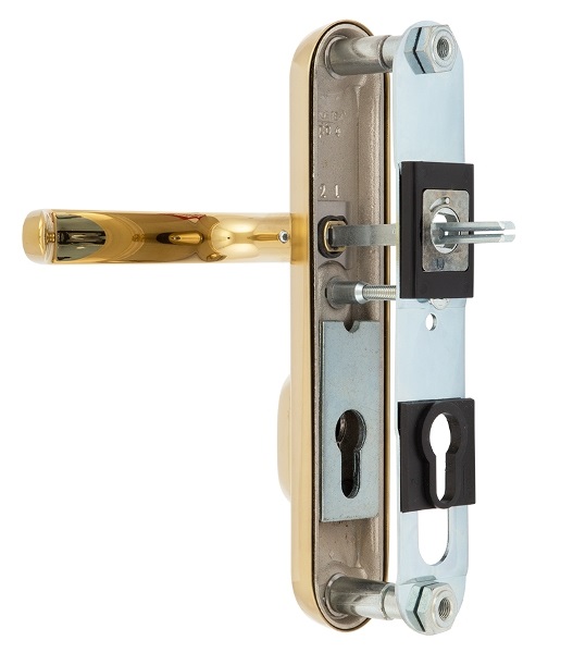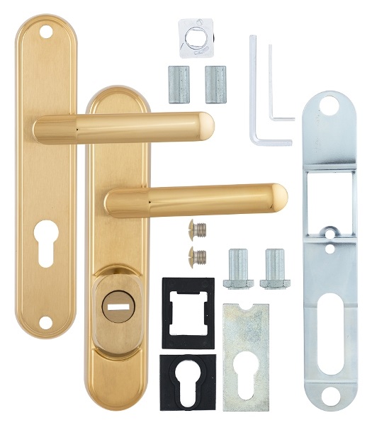 Зламостійкі ручки на планці з протектором чеського виробництва ROSTEX. Якщо у Вас виникає потреба надійно захистити замок та серцевину, то ця модель зможе повністю задовільнити її. Ручки виготовляються із міцної нержавіючої сталі, планки в свою чергу виготовляються із цинкового сплаву. Ззовні планки не видно отворів для кріплення, вони знаходяться в середині і фіксуються за допомогою двох масивних гвинтів М8. Серцевина захищена протектором із гартованої сталі і шайбою з отвором під ключ з нержавіючої сталі. Завдяки цьому ця модель має високий рівень захисту від висвердлювання, виламування та інших силових методів зламу. Кольоровий відтінок захищений спеціальним методом гальваніки, що гарантує його стійкість до стирання протягом 120 місяців. Приємний колір – титан PVD матовий – чудово підкреслить приміщення в спокійних золотих тонах. Ця модель оснащена зручною нажимною частиною з металевим пружиним механізмом, завдяки чому ручки не будуть провисати та розхитуватись. Під час вибору зверніть увагу на міжосьову відстань ручок та Вашого механізму замка. Дані ручки підходять тільки для механізмів замка з міжосьової відстанню 85 мм. За необхідності монтажу фурнітури на товстіші двері рекомендуємо придбати відповідний подовжуючий набір.