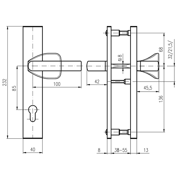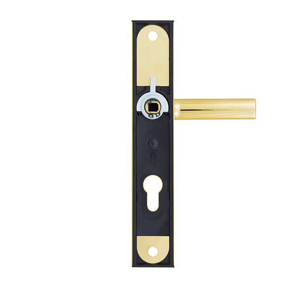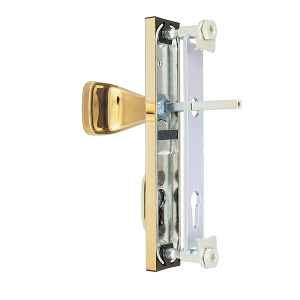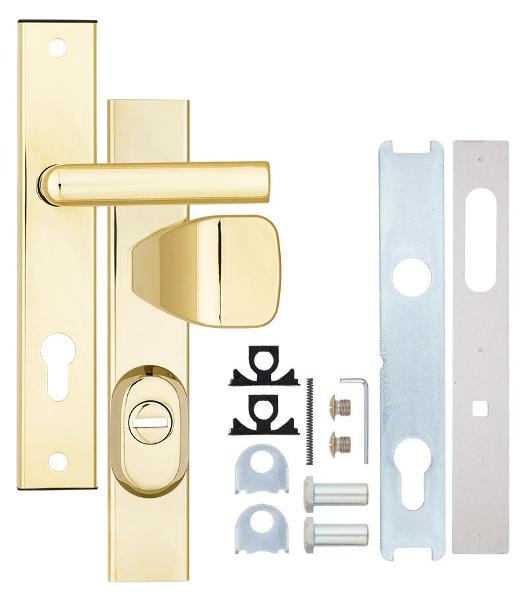 Зламостійкі ручки на планці з протектором чеського виробництва ROSTEX. Якщо у Вас виникає потреба надійно захистити замок та серцевину, то ця модель зможе повністю задовільнити її. Ручки виготовляються із міцної нержавіючої сталі, планки в свою чергу виготовляються із цинкового сплаву. Ззовні планки не видно отворів для кріплення, вони знаходяться в середині і фіксуються за допомогою двох масивних гвинтів М8. Серцевина захищена протектором із гартованої сталі і шайбою з отвором під ключ з нержавіючої сталі. Завдяки цьому ця модель має високий рівень захисту від висвердлювання, виламування та інших силових методів зламу. Кольоровий відтінок захищений спеціальним методом гальваніки, що гарантує його стійкість до стирання протягом 120 місяців. Яскравий колір – титан PVD – добре поєднується з інтер’єром в світло-золотих відтінках. В цієї моделі тип ручок різний, з одного боку це звичайна нажимна, а з іншого фіксована. Зазвичай такі ручки використовують в приміщеннях з великим трафіком людей. Під час вибору зверніть увагу на міжосьову відстань ручок та Вашого механізму замка. Дані ручки підходять тільки для механізмів замка з міжосьової відстанню 85 мм. За необхідності монтажу фурнітури на товстіші двері рекомендуємо придбати відповідний подовжуючий набір.