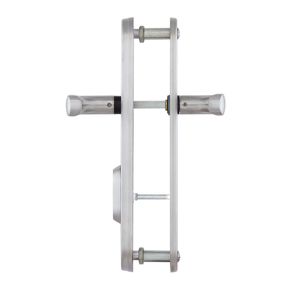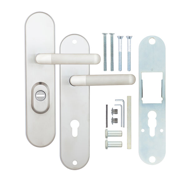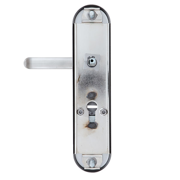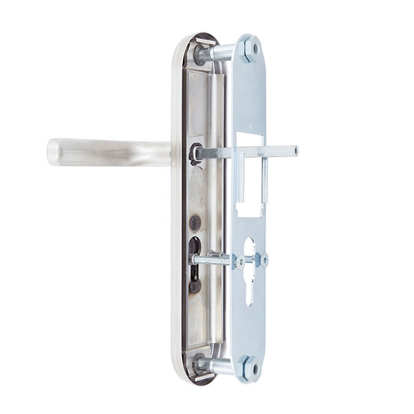 Зламостійкі ручки на планці з протектором чеського виробництва ROSTEX. Якщо у Вас виникає потреба надійно захистити замок та серцевину, то ця модель зможе повністю задовільнити її. Ручки виготовляються із міцної нержавіючої сталі, планки в свою чергу виготовляються із цинкового сплаву. Ззовні планки не видно отворів для кріплення, вони знаходяться в середині і фіксуються за допомогою двох масивних гвинтів М8. Серцевина захищена протектором із гартованої сталі і шайбою з отвором під ключ з нержавіючої сталі. Завдяки цьому ця модель має високий рівень захисту від висвердлювання, виламування та інших силових методів зламу. Кольоровий відтінок захищений спеціальним методом гальваніки, що гарантує його стійкість до стирання протягом 120 місяців. Колір нержавіюча сталь матова - прекрасно доповнить приміщення в холодних світлих тонах, а інтер'єру в темних відтінках додасть трохи контрасту. Ця модель оснащена зручною нажимною частиною з металевим пружиним механізмом, завдяки чому ручки не будуть провисати та розхитуватись. Під час вибору зверніть увагу на міжосьову відстань ручок та Вашого механізму замка. Дані ручки підходять тільки для механізмів замка з міжосьової відстанню 72 мм. За необхідності монтажу фурнітури на товстіші двері рекомендуємо придбати відповідний подовжуючий набір.