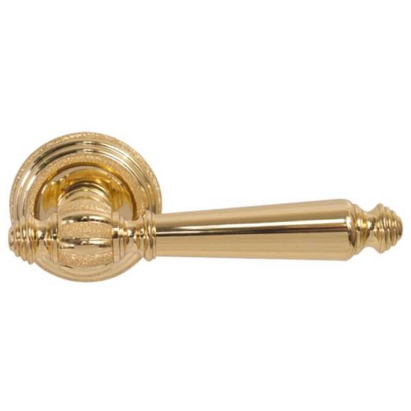 Італійські ручки на розеті популярної торгової марки FIMET. Найкращий вибір для міжкімнатних дверей. Виготовленні з високоякісного латунного сплаву за традиційними італійськими технологіями виробництва. Нажимна частина ручки приємно лягає в руку та зручна у використанні. Завдяки спеціальній двовитковій пружині ручка не буде провисати. Багатошарове гальванічне покриття забезпечить стійкість кольорового відтінку до стирання та подряпин. Сучасний колір золото Pave із домішками золота в 24 карати, що надає унікального відтінку та блиску, чудово підійде для приміщення в світло-золотих тонах. Ця модель ручок підійде до дверей в класичному стилі і довершить загальну картину інтер'єру.
