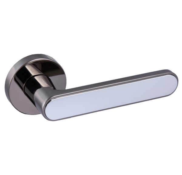 Комплект роздільних ручок французької ТМ "GAVROCHE" - відмінна якість і довговічність роботи. Ручки суцільнолиті, важкі, виготовлені із цинкового сплаву. Кольоровий відтінок наноситься спеціальним методом – гальваніки. Це гарантує термін служби покриття протягом 60 місяців - офіційна гарантія виробника. Зручна форма нажимної частини зробить користування приємним. Особливість цієї моделі - суцільна пласка кругла розета, яка фіксується гужоном. Це робить ручку надзвичайно стильною та оригінальною. На дверному полотні виглядає вишукано та елегантно. Поєднання відтінків - чорний нікель із хромованою вставкою - довершить двері в сірих тонах. Дуже гарно виглядатиме на полотнах з чорним склом. Якщо у Вас приміщення в стилі хай-тек або модер - саме ця ручка - прекрасний вибір. В ручках такого типу не видно отворів для кріплення, вони прикриваються зовнішньою кришкою розети. Ручка просто і легко монтується. Залежно від встановленого замка та товщини дверей, ручку можна зафіксувати на стяжні гвинти або саморізи.