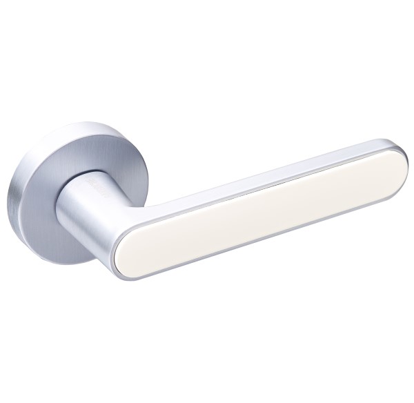 Комплект роздільних ручок французької ТМ "GAVROCHE" - відмінна якість і довговічність роботи. Ручки суцільнолиті, важкі, виготовлені із цинкового сплаву. Кольоровий відтінок наноситься спеціальним методом – гальваніки. Це гарантує термін служби покриття протягом 60 місяців - офіційна гарантія виробника. Зручна форма нажимної частини зробить користування приємним. Особливість цієї моделі - суцільна пласка кругла розета, яка фіксується гужоном. Це робить ручку надзвичайно стильною та оригінальною. На дверному полотні виглядає вишукано та елегантно. Вдале поєднання відтінків - італійський сатин і бежева вставка - довершить двері в білих та бежевих тонах. Якщо у Вас приміщення в стилі хай-тек або модерн - саме ця ручка - прекрасний вибір. В ручках такого типу не видно отворів для кріплення, вони прикриваються зовнішньою кришкою розети. Ручка просто і легко монтується. Залежно від встановленого замка та товщини дверей, ручку можна зафіксувати на стяжні гвинти або саморізи.