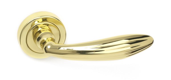 Ручки на розеті португальського виробництва TUPAI. Дверна фурнітура зроблена з урахуванням екологічних європейських стандартів. Виготовляється із латуні за сучасними технологіями на фабриці в Португалії. Золото поліроване – це яскравий колір, який чудово доповнить інтер’єр із золотими елементами та наповнить приміщення світлими відтінками. Покриття наноситься спеціальним методом гальваніки у декілька шарів. Завдяки цьому ручки виглядатимуть як нові до 24 місяців. Додатково це забезпечує стійкість кольору до пошкодження та подряпин. Також нажимна частина має подвійну металеву пружину, завдяки чому ручка не буде провисати. Вишуканий класичний дизайн ручки чудово доповнить дверне полотно з плавними лініями.