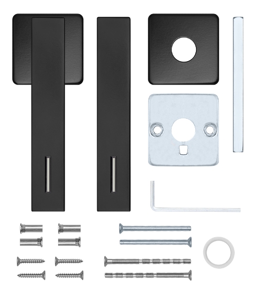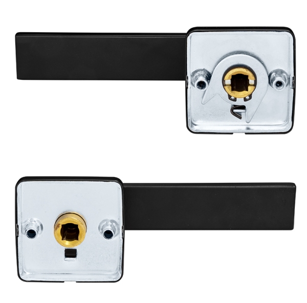 Ручки з квадратною розетою чеського виробника ROSTEX зазвичай встановлюють в міжкімнатні та вхідні двері приміщень приватного та громадського призначення. Виготовлені з нержавіючої сталі, що дає можливість їх використання при різних погодних умовах. Чорний колір максимально органічно підійде для сучасного high-tech чи лофт-дизайну. Основною ж фішкою даної моделі ручок є вбудована скляна капсула з люмінофором на стінках і тритієм всередині, через який відбувається підсвічування в темряві. Причому це може тривати десятки років без жодних батарейок чи інших джерел. Це дасть вам змогу без проблем відшукати ручку навіть в повній темряві. Завдяки якісній поворотній пружині, ручки працюють без зайвих зусиль та служитимуть довгий час. Отвори для кріплення прикриваються розетою.