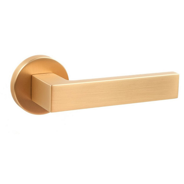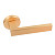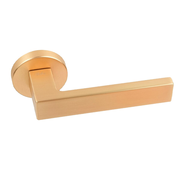 Ручки з цинкового сплаву в кольорі “матове золото” підійдуть до полотен аналогічних відтінків. Прямі лінії натискної частини але водночас кругла розета дозволяють використовувати їх під будь-який дизайн стилю хай-тек чи модерн.