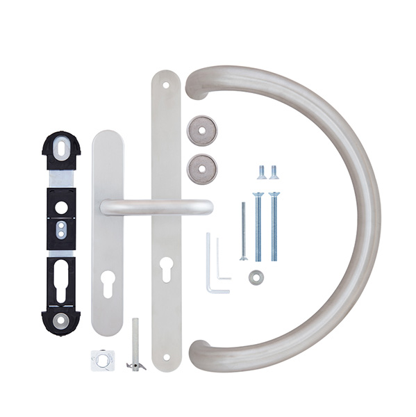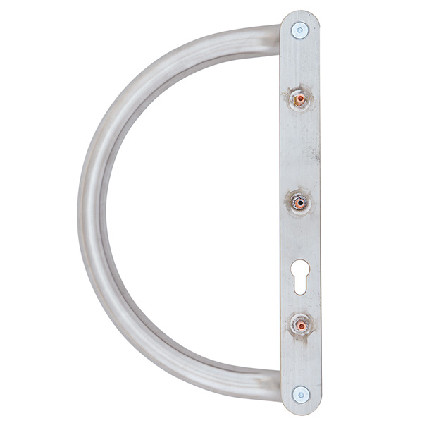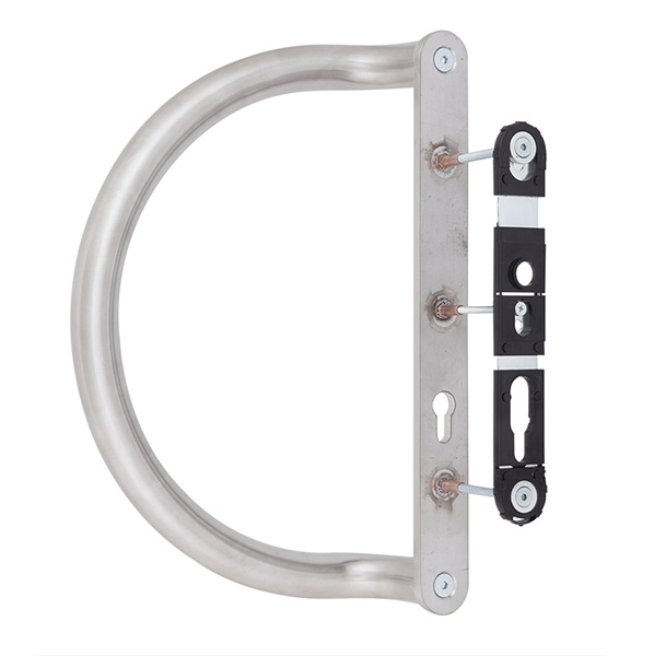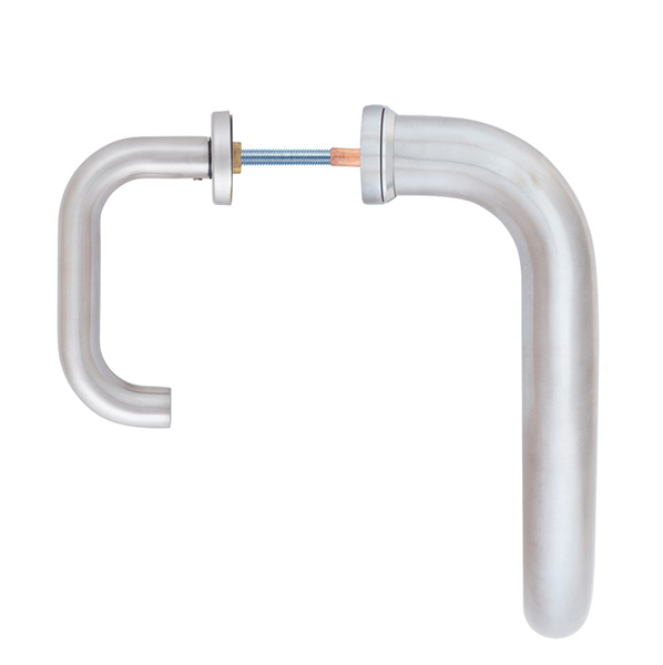 Ручки скоби чеської торгової марки ROSTEX. Призначені для використання на вхідних дерев’яних та металевих дверях. Виготовляються із нержавіючої сталі. Це міцний матеріал, який не боїться навантажень та стійкий до корозії. Дана модель поєднує в собі два різних типи ручок. З одного боку це нажимна ручка на планці, яка посилена металевою пластиною. А з іншого фіксована скоба. Таке поєднання чудово підійде для офісних приміщень чи для приватних будинків, де використовують електромоторний замок. Додатково на скобі є протектор із гартованої сталі, який забезпечить надійний захист Вашої серцевини від висвердлювання та виламування. Основним технічним критерієм при виборі такої ручки є її довжина, відстань між кріпленнями та міжосьова відстань. Ця модель підходить лише для механізму замка з міжосьовою відстанню 85 мм. Процес кріплення здійснюється за рахунок наскрізних отворів, куди вставляється спеціальні стяжні гвинти М6х75мм. Далі ці гвинти зсередини через ручку на планці вкручуються в скобу, завдяки чому гарантують надійну фіксацію до дверного полотна.