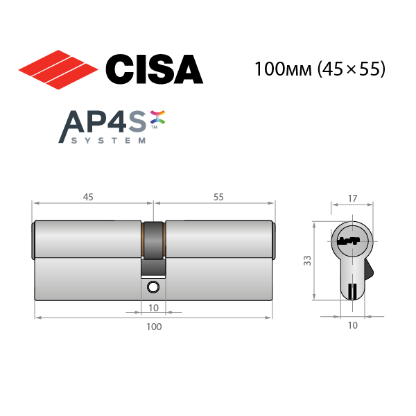 - Циліндр CISA AP4 S 100 (45*55) нікель матовий 3 ключі ⭐